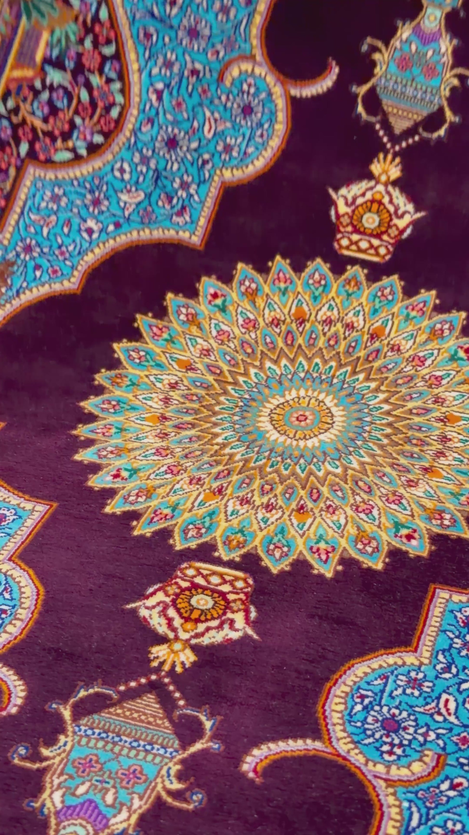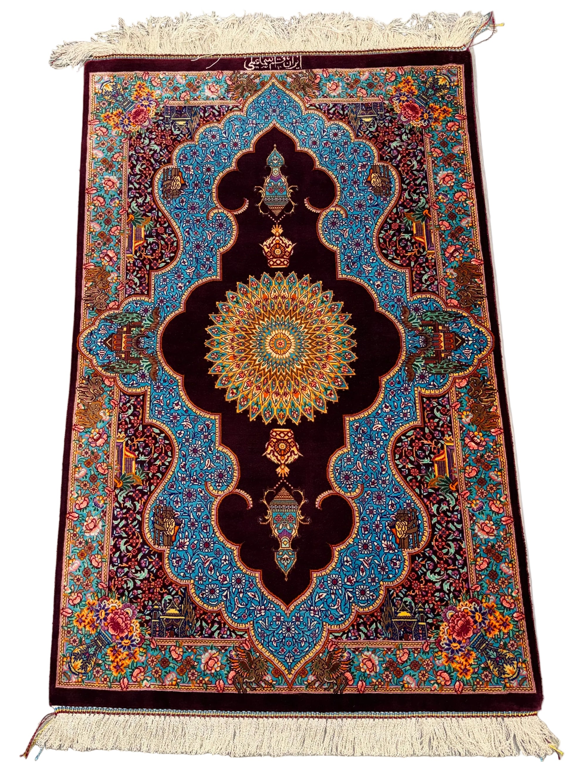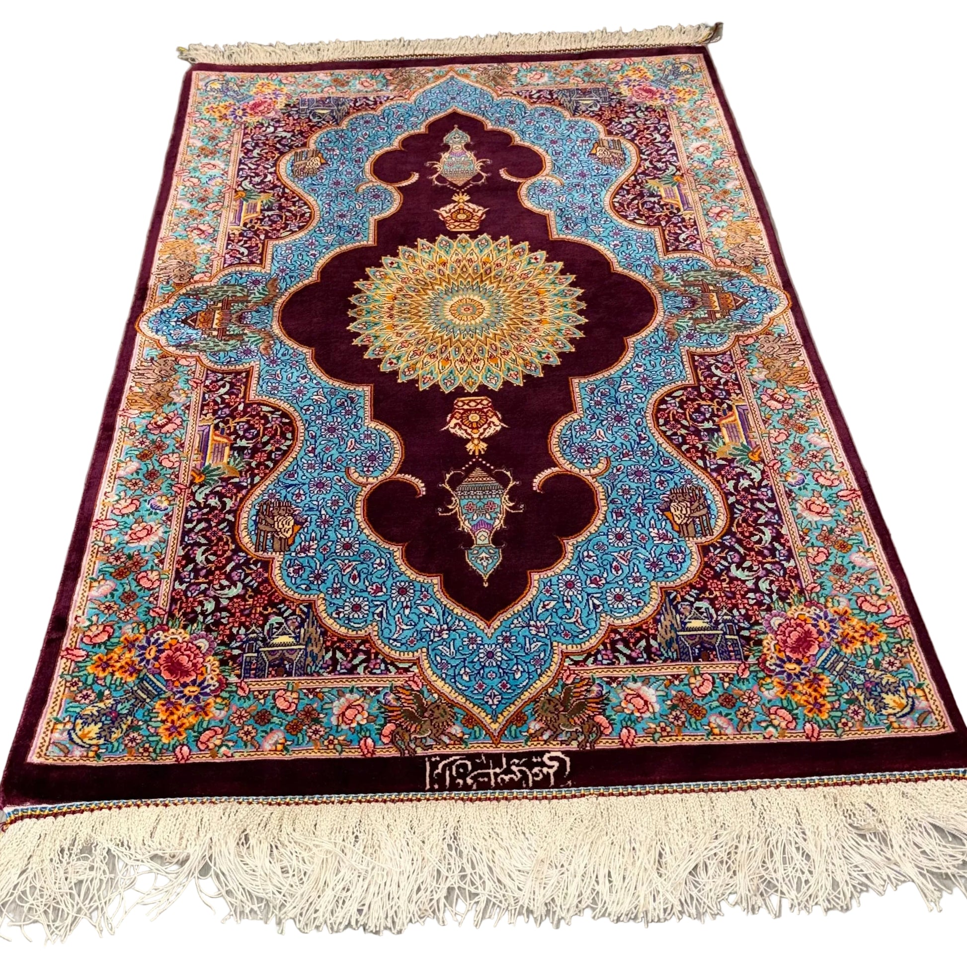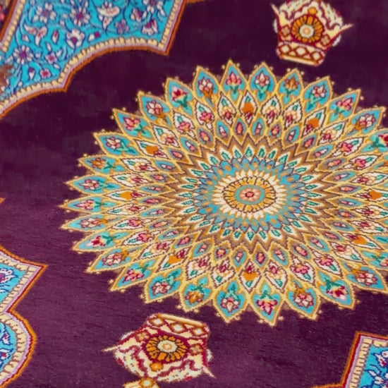 An exquisite hand-knotted silk rug woven in Qom, Iran, renowned for producing some of the finest silk carpets in the world.